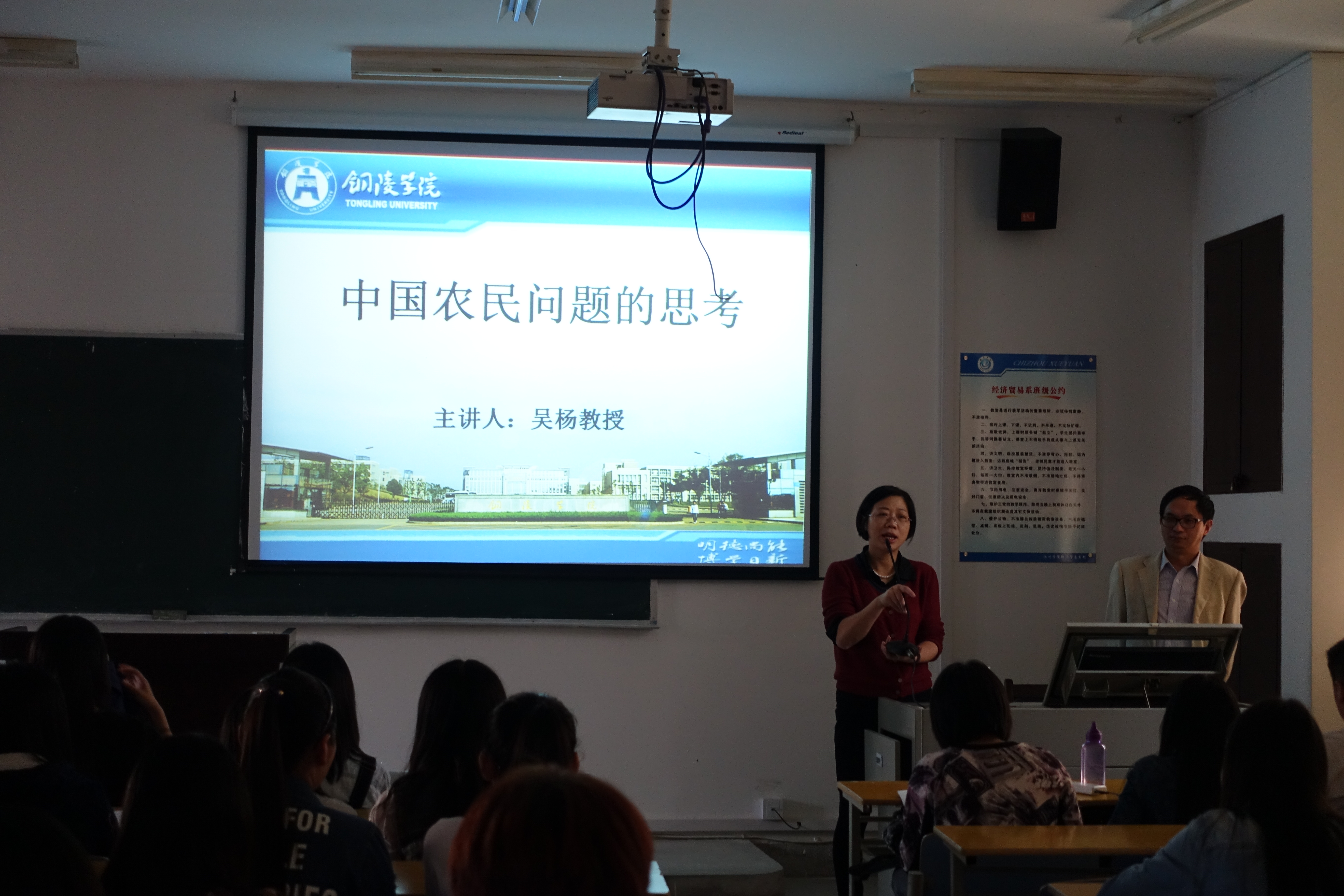 10月16日,铜陵学院经济学院党总支书记、院长吴杨教授应邀来我院讲学。讲座在博识南403教室举行。商学院院长项桂娥教授出席并主持讲座。商学院国际经济与贸易等相关专业学生认真聆听了报告。