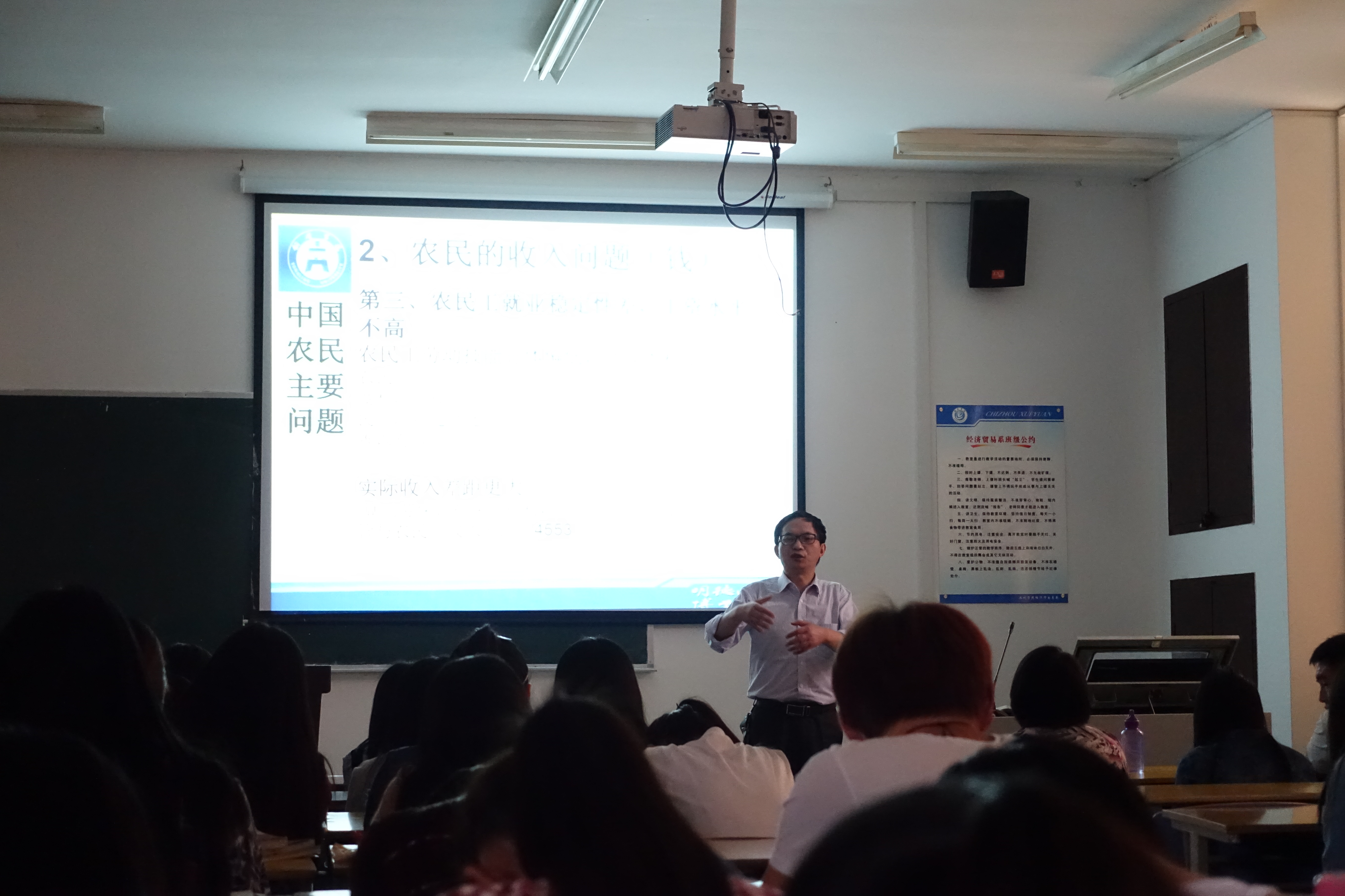 吴杨教授为商学院学生带来了题为“中国农民问题的思考”的专题报告,吴教授从重视中国农民问题、中国农民主要问题及解决路径三个方面,结合我国重视中国农民问题的必要性、通过对农民的土地、收入、发展等问题的分析,阐述了我国农民的主要问题表现,并运用大量的案例对我国农民的主要原因进行了深入的剖析,最后提出重视“重中之重”、城乡一体化、维护利益、坚持改革的解决农民问题路径。整场报告会深入浅出,结合实际,获得参会学生的一致好评。
