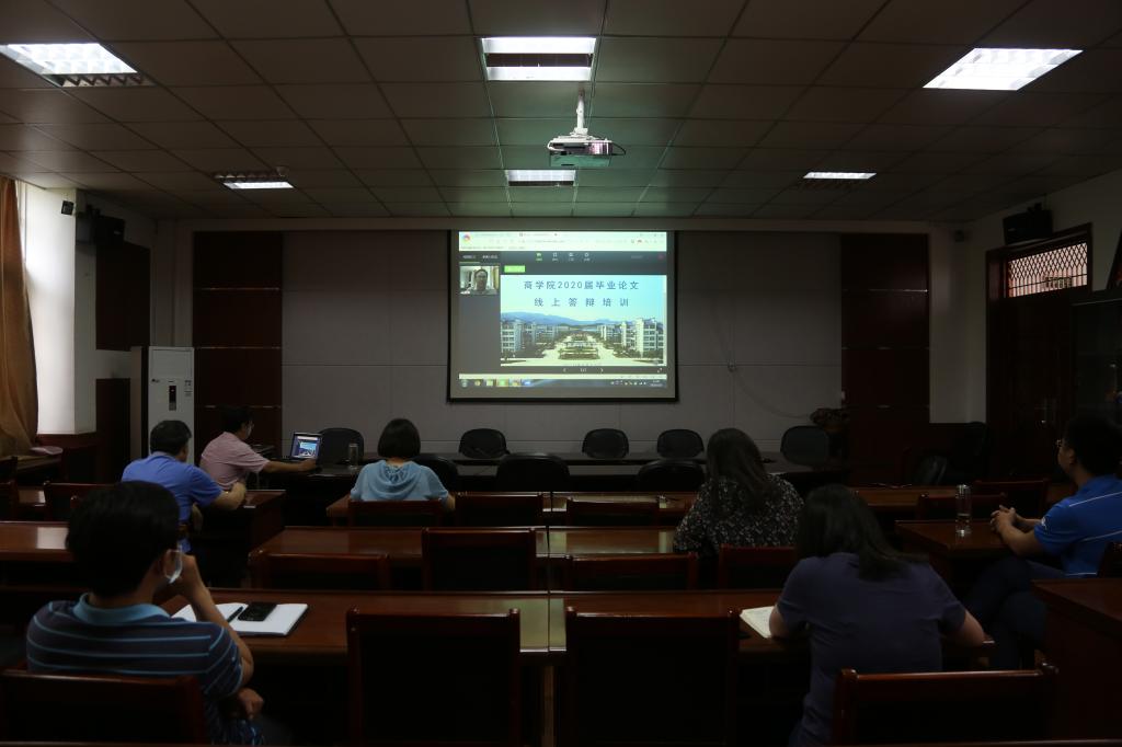 为进一步规范和推动2020届毕业论文线上答辩工作事宜,5月15日中午,商学院在会议室召开2020届毕业论文线上答辩专题培训会,围绕毕业论文指导、评阅和答辩工作开展专题培训。商学院党委书记罗志刚、院长项桂娥、副院长吴自爱、各教研室主任及商学院全体教师参加会议。会议采用现场直播方式进行,部分老师通过观看直播参加本次会议。