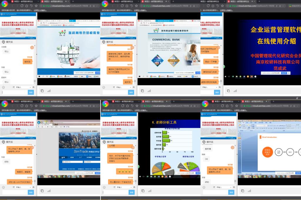 全方位调度,狠抓工作落实。疫情防控期间,学院积极通过网络会议,围绕各项教学工作开展全方位调度。通过网络会议,先后邀请了新道工程师孙阳春围绕“直播教学师资、U8安装与使用技术”,世格软件技术工程师吴健围绕“跨境电商平台、SimTrade在线使用技术”,浙科软件技术工程师姜绿洲围绕“商业银行模拟教学软件、网络营销模拟教学软件两款软件在线使用技术”,南京校研技术工程师范成武围绕“企业运营管理软件在线使用技术”分别为商学院所有实验课教师进行了专场线上师资培训,确保了疫情防控期间线上实践教学的开展和教学质量的提升。