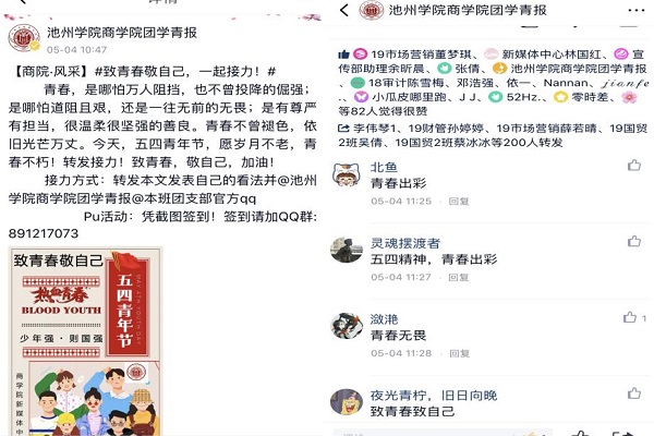 疫情防控期间,商学院依托“云”平台,及时向全体师生传达学习习近平总书记最新关于疫情防控工作的重要指示精神和学校党委的决策部署,发布新冠肺炎防护手册,组织开展新冠肺炎防护知识的学习,及时宣传疫情防控中涌现出来的先进人物和事迹,组织开展了施咏康同志先进事迹学习活动,广泛开展“五四”运动光荣历史的宣传工作,组织开展了“致青春,敬自己”线上接力活动、五四青年节——红色信息征集活动。充分发挥网络优势,因时而化,因时而新,使战“疫”成为学生学习的大课堂,成长的大熔炉。