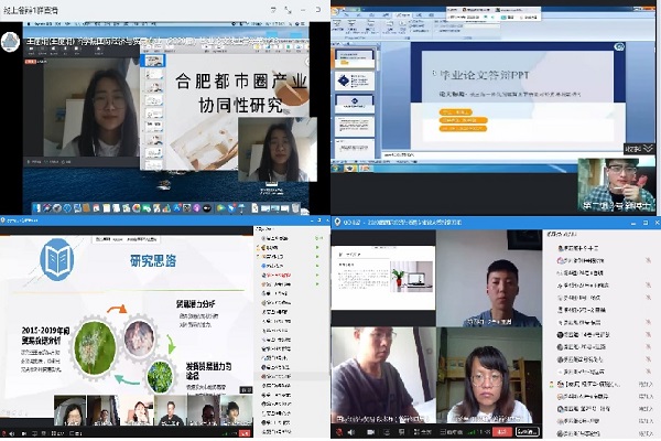 本次答辩主要采用QQ群屏幕分享和钉钉课堂的方式进行线上答辩,答辩依次进行,答辩学生先就论文的研究意义、观点、创新与不足等进行PPT陈述,陈述完毕后回答答辩老师提出的问题,同时老师就论文存在的问题提出修改意见。每位学生的答辩时间控制在10分钟左右。