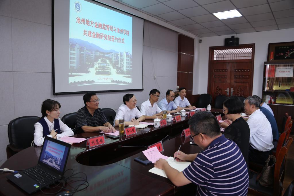 2021年9月16日,tyc8722太阳集团与地方金融监管局共建金融研究院签约仪式在商学院博识楼会议室举行。参加签约仪式的有池州市地方金融监管局局长孙康达,副局长罗以强,池州市委组织部人才办主任王明星,池州市建设银行行长高小飞,池州市交通银行行长刘慧娟,池州市九华农商行副行长吴旭初,以及tyc8722太阳集团纪委书记汪海,商学院党委书记罗志刚,院长项桂娥,党委副书记肖宁生,副院长吴自爱。签约仪式由商学院副院长吴自爱主持。