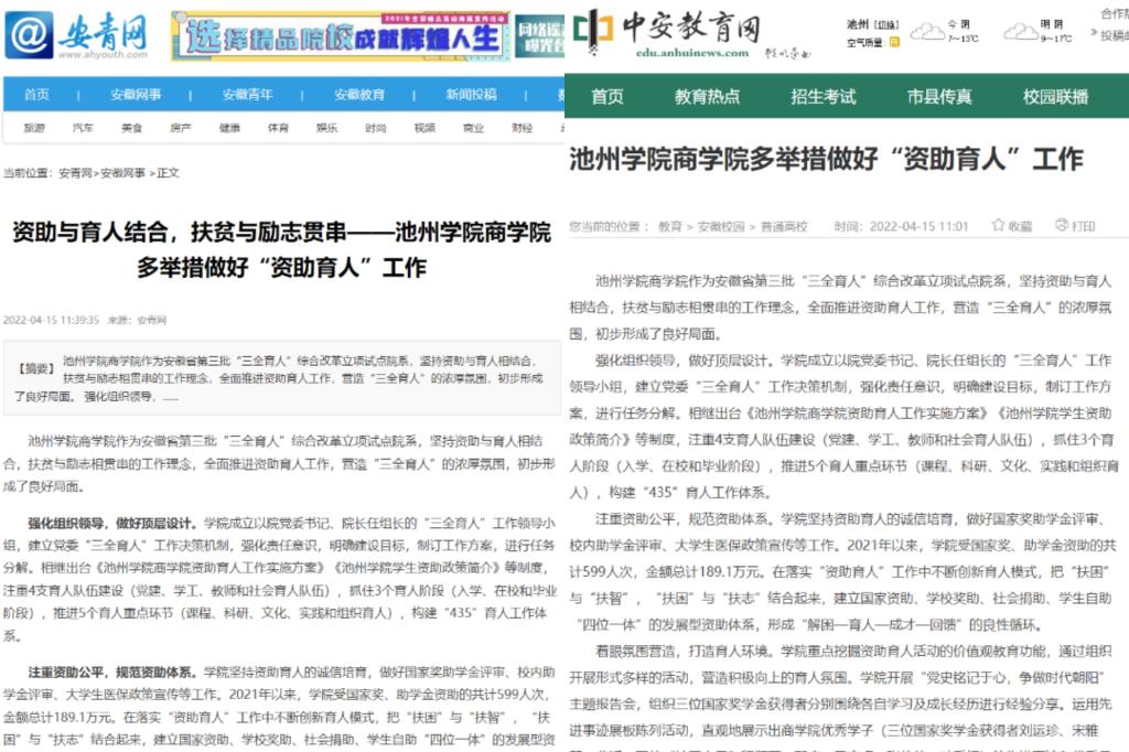 4月15日,安青网、中安教育网等媒体以《资助与育人结合,扶贫与励志贯串——太阳集团网站8722多举措做好“资助育人”工作》为题,从组织领导、资助体系、氛围营造、精准资助等四个方面对商学院“资助育人”工作进行报道。