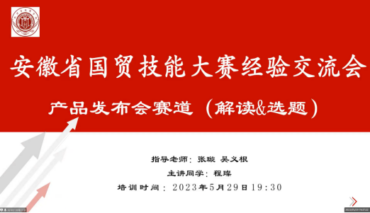本次活动邀请了2022年获奖的两支队伍就安徽省国贸技能大赛决赛内容进行经验分享。程璨同学就新产品发布会赛道从评审精要、参赛准备、项目选题和队伍组建四个方面进行了全面细致解读,叶千红同学则围绕大数据分析报告的撰写从团队分工、数据处理、分析技巧、PPT制作等方面分享了自己的经验,干货满满。最后张璇老师从指导老师的角度针对学生在比赛中容易出现的问题进行了总结和说明。