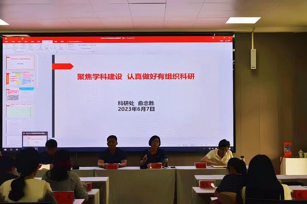 6月7日,科研处副处长俞念胜教授应邀来学院作题为“聚焦学科建设认真做好有组织科研”的专题报告,报告由商学院院长项桂娥主持。商学院党政领导班子和全体教师听取报告。