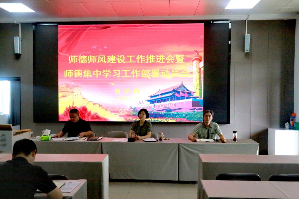 为扎实深入推进师德师风建设,提升教师政治素养和道德修养,7月3日下午,商学院在博识北401举行师德师风建设工作推进暨师德集中学习教育工作部署动员会,全体教职工参会,会议由学院党委负责人肖宁生主持。