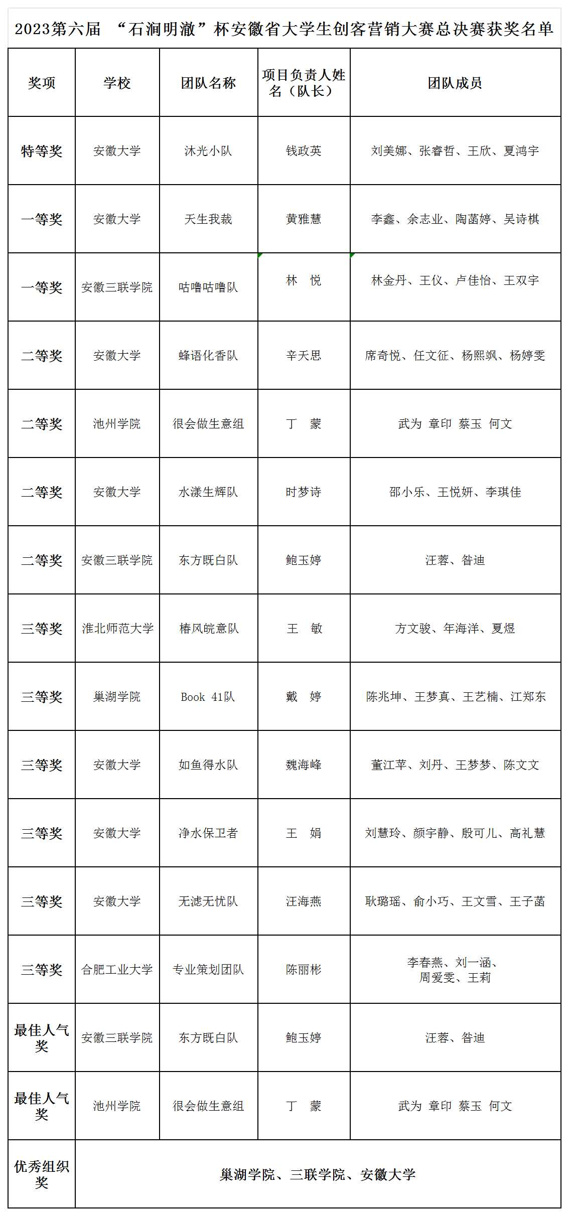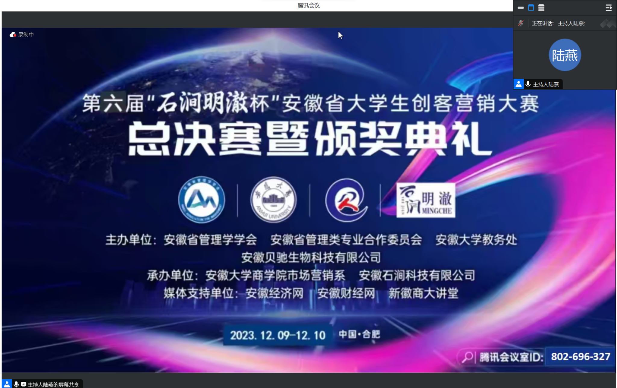 2023年12月10日,安徽省管理学学会、安徽省管理类专业合作委员会、安徽大学教务处、安徽贝驰生物科技有限公司主办,安徽大学商学院市场营销系、安徽石涧科技有限公司承办的第六届“石涧明澈杯”安徽省大学生创客营销大赛总决赛在一片热情洋溢的氛围中于腾讯会议室云端圆满落幕。