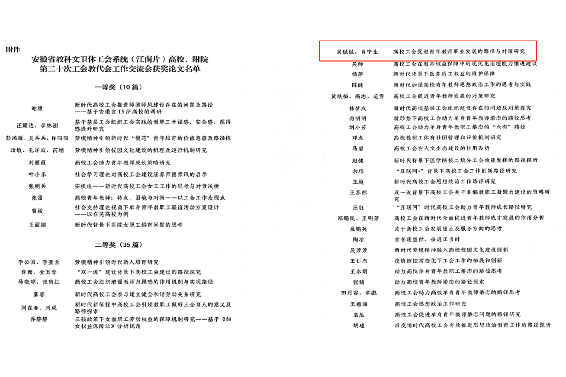 12月21日,安徽省科教文卫体工会系统(江南片)高校、附院第二十次工会教代会优秀论文评选情况公布,商学院吴铖铖、肖宁生撰写的《高校工会促进青年教师职业发展的路径与对策研究》荣获二等奖。