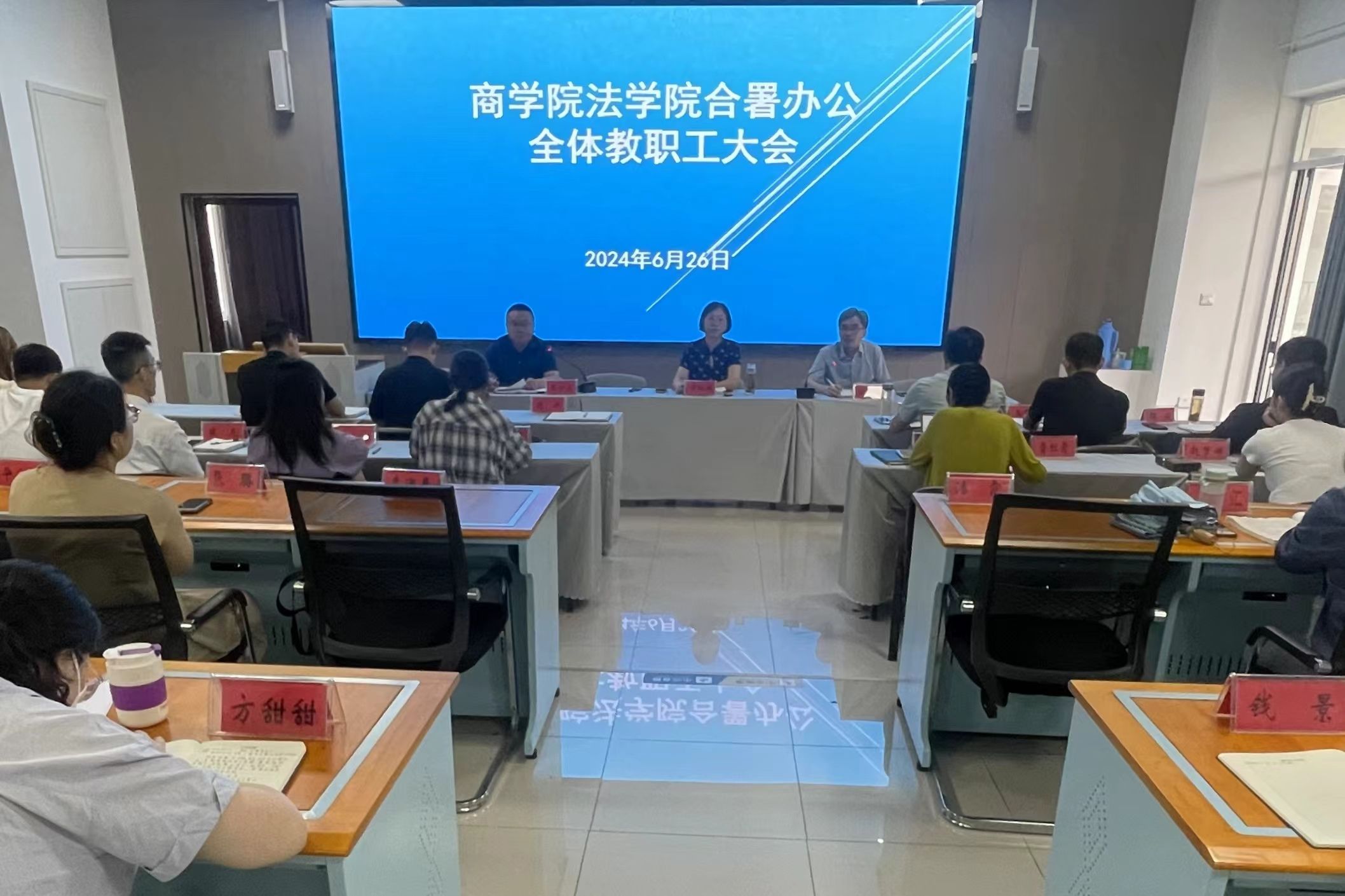 6月26日,商学院、法学院合署办公第一次全体教职工大会在博识北401多媒体教室召开。太阳集团网站8722全体教职工和部分兼职辅导员90余人参会,会议由院党委书记肖宁生主持。
