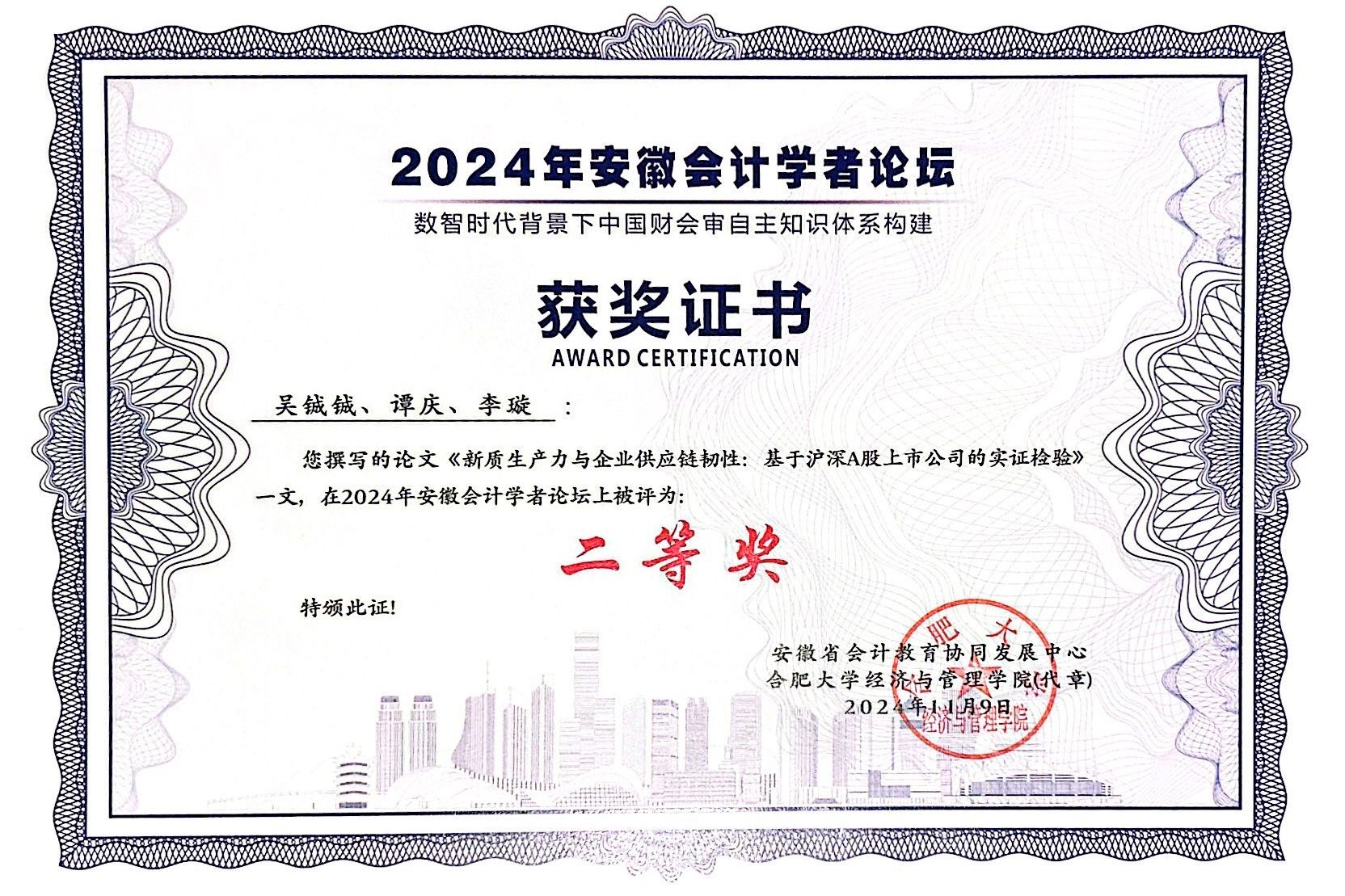 分论坛报告阶段,吴铖铖老师就“新质生产力与企业供应链韧性:基于沪深A股上市公司的实证检验”进行主题报告,探讨新质生产力对企业供应链韧性的影响效果与作用机制,专题报告获得与会专家学者的一致好评,研究成果获评2024年安徽会计学者论坛二等奖。