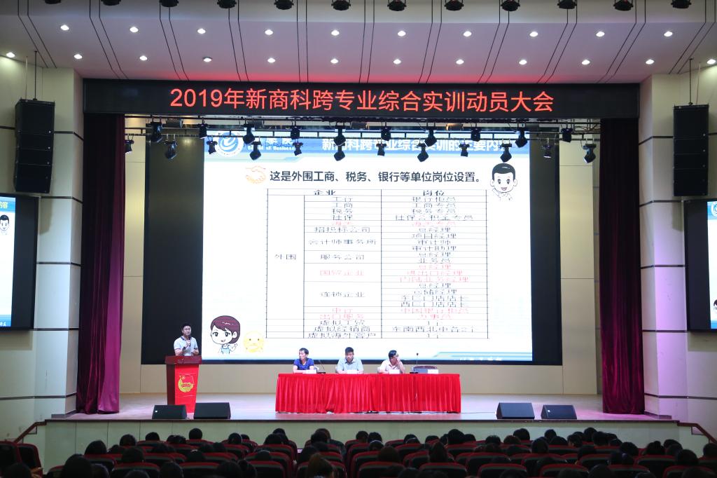 9月29日晚上7点,商学院在博古楼大礼堂开展新商科跨专业综合实训动员大会。商学院党委书记罗志刚、分管教学科研副院长吴自爱、新商科跨专业综合实训师资团队成员、16级辅导员、16级各班学生参加动员大会。