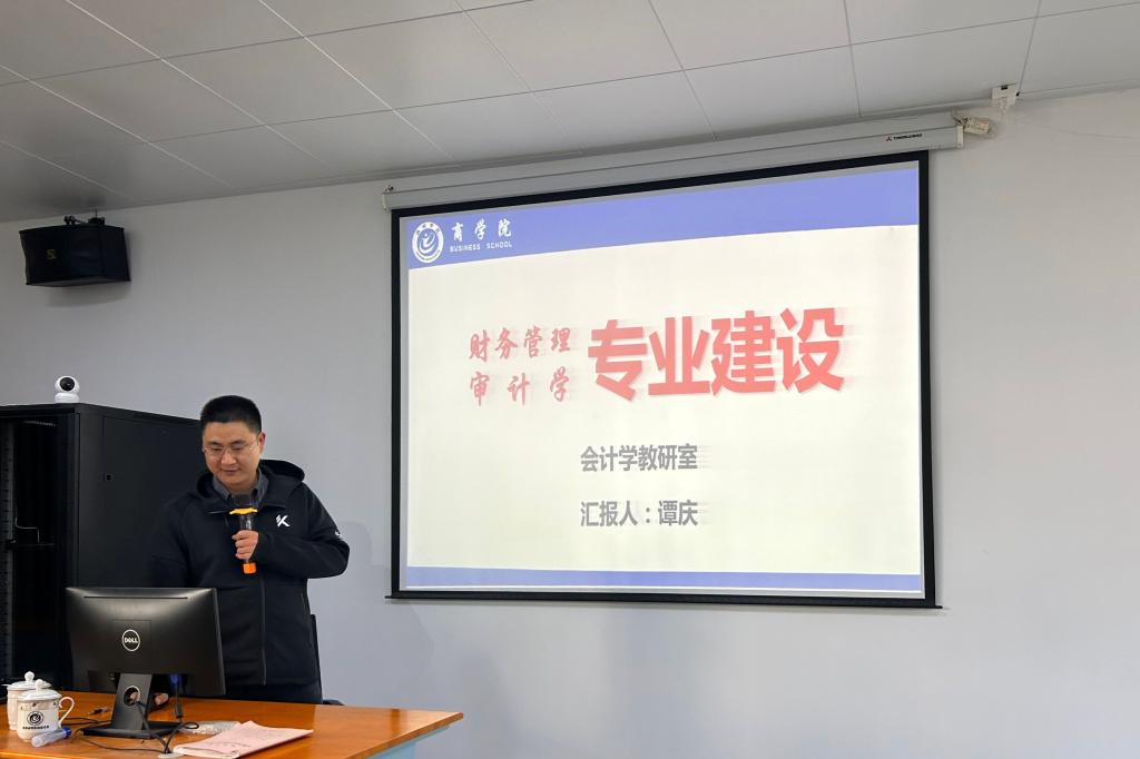 会计教研室主任谭庆副教授首先汇报了专业建设基本概况,接着从供需结构矛盾的角度指出目前人才培养存在供给要素失衡的问题,最后从教育供给要素结构创新的角度提出了专业建设的发展方向,需要进一步加强师资队伍建设,推进学科交叉融合创新,重构会计课程体系,探索会计教学方式,以及加强智能教育平台创新。在汇报结束后,与会人员围绕专业建设等方面提出宝贵的意见和建议。