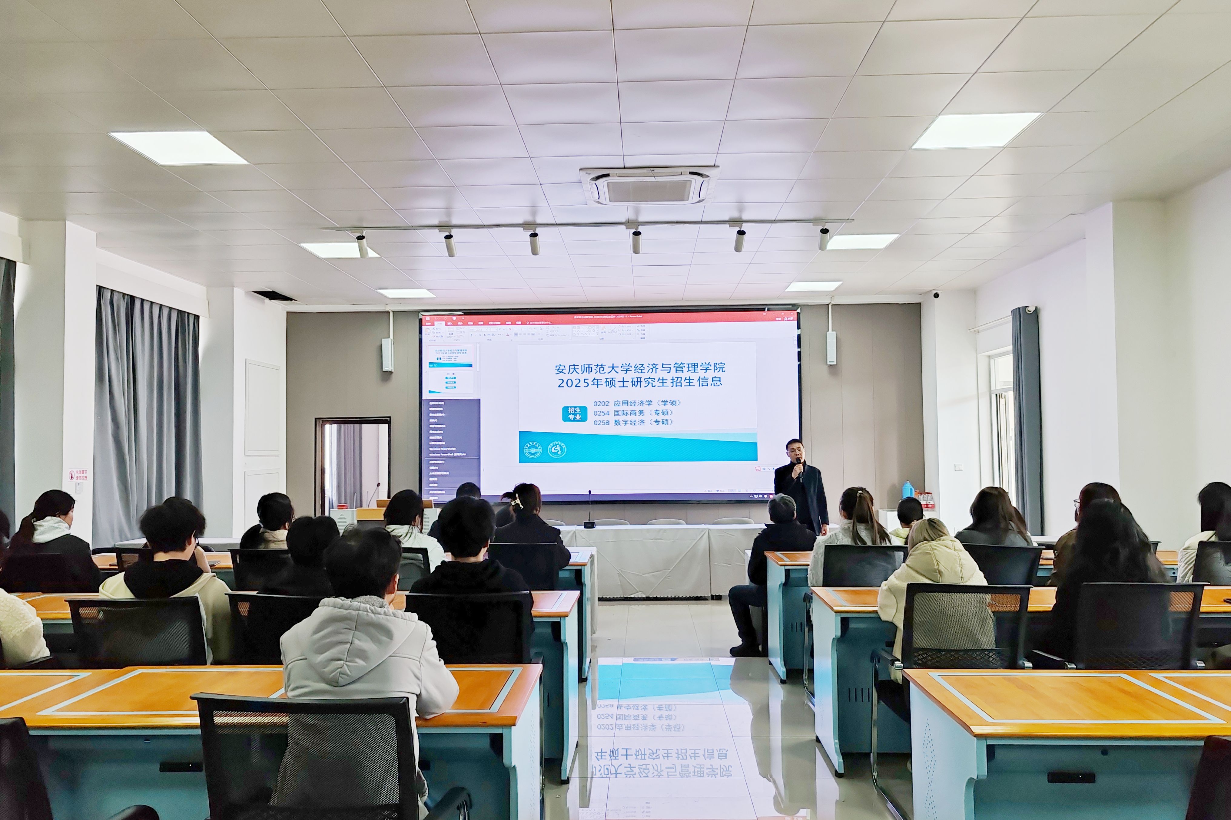 2025年3月18日下午,安庆师范大学经济与管理学院在学院博识楼北401开展2026年硕士研究生招生宣讲会。宣讲会由商学院副院长吴义根主持,学院近60多名考生参加。