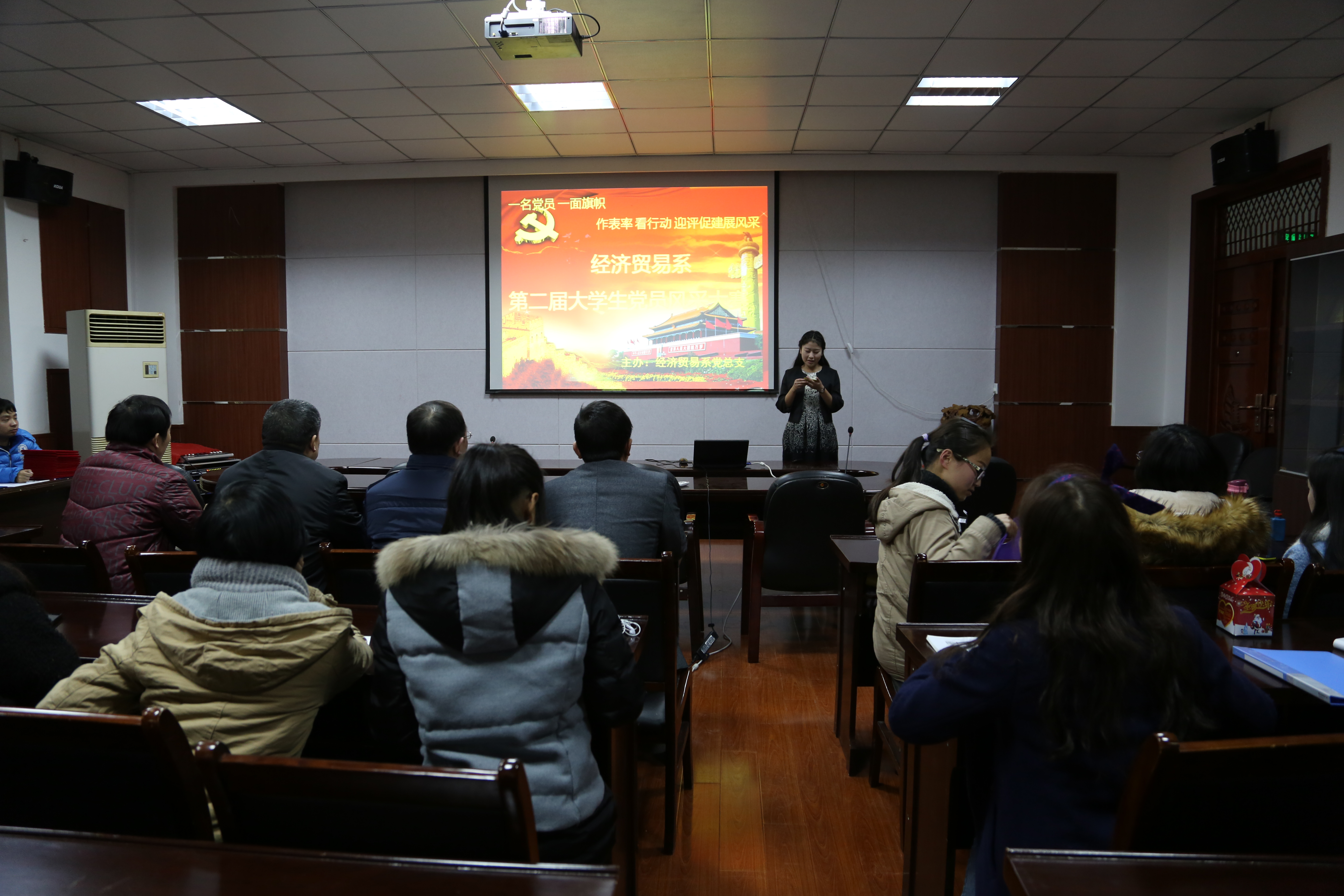 2014年12月24日晚,经贸系在系会议室举办了以“一名党员、一面旗帜”为主题的大学生党员风采大赛。系党总支书记罗志刚、副主任杨荣明、实习实训中心主任吴自爱以及学生党支部书记苏飞等参加了此次活动,此外系学生党员、第49期入党积极分子代表也观看了这次比赛。