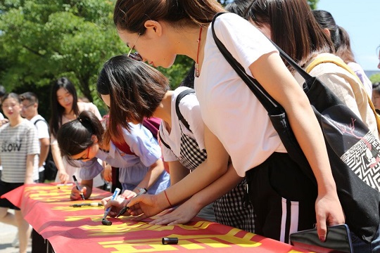 期末考试临近,为树立党员和学院学生干部的形象,发挥先锋模范作用,6月21日上午,在商学院党总支领导下,商学院学生党员、入党积极分子、学院学生干部在博识楼前参加了以“诚信考试”为主题的主题党日活动。