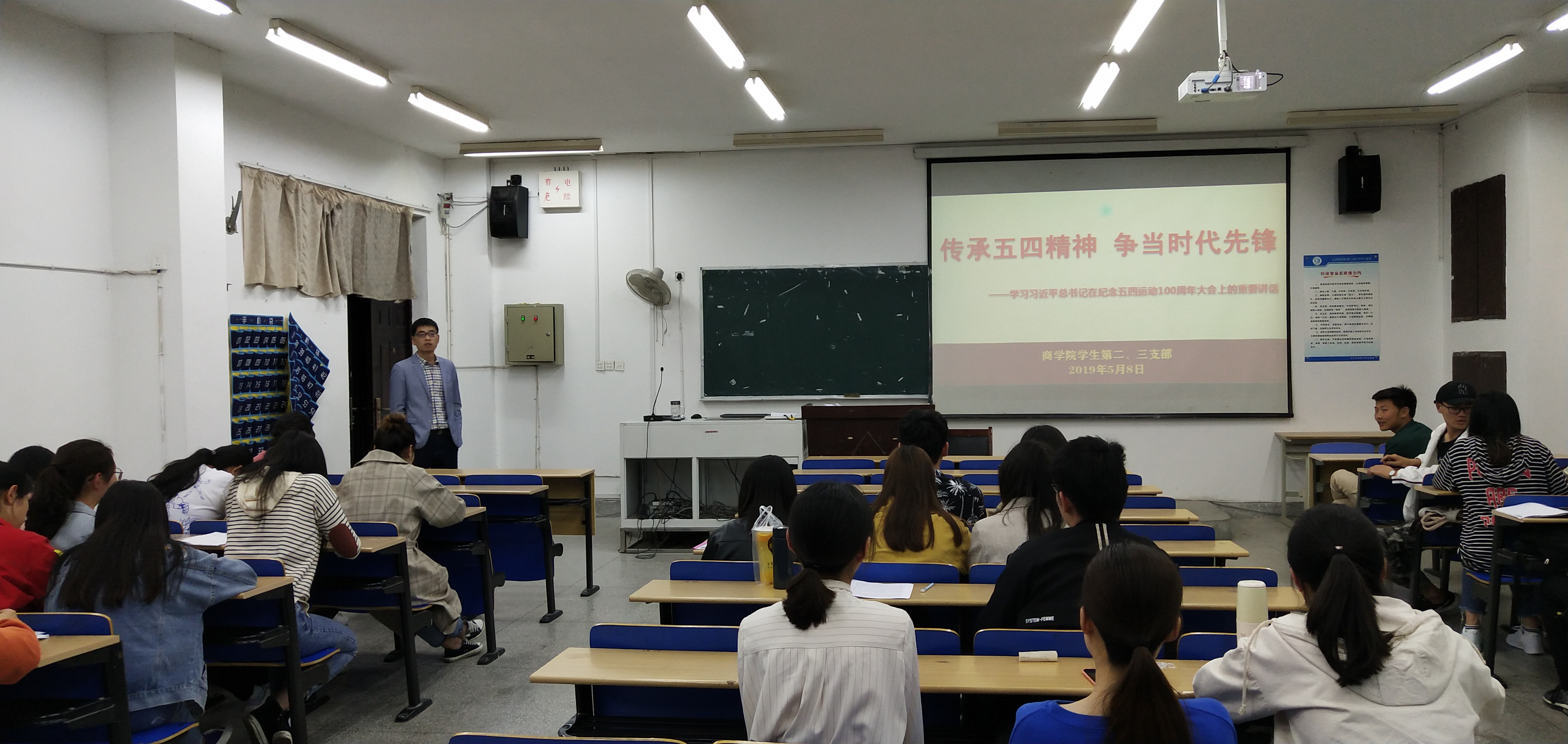 为深入学习贯彻习近平总书记在纪念五四运动100周年大会上的重要讲话精神。5月8日晚,商学院学生第二、三党支部组织学生党员和发展对象在博识南402教室开展了以“传承五四精神 争当时代先锋”为主题的党日活动。