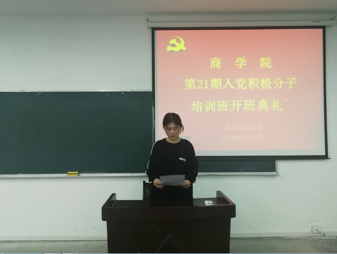 4月25日晚,商学院第二十一期入党积极分子培训班开班典礼在博识南403教室隆重举行,商学院党总支委员、学生党支部书记及101名学员参加了开班典礼。开班典礼由党总支委员、院长项桂娥主持。