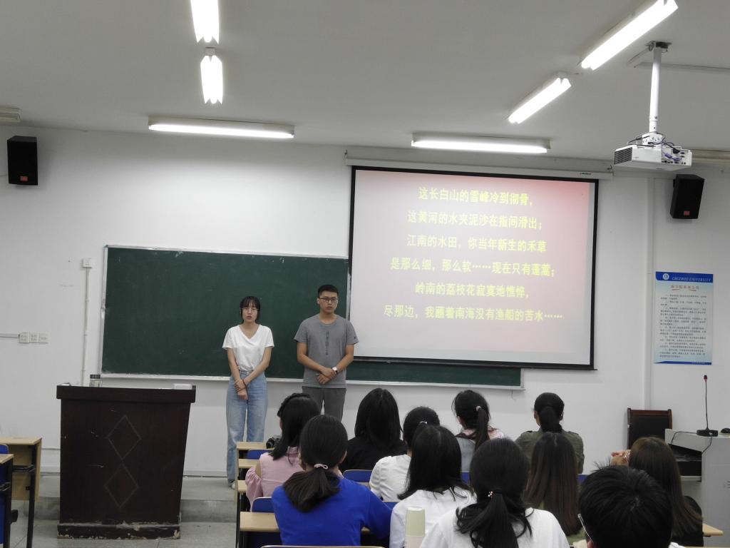 为深入推进“不忘初心、牢记使命”主题教育活动,庆祝新中国成立70周年,进一步加强爱国主义教育、弘扬爱国主义精神。9月29日晚,商学院学生第二、三党支部组织学生党员和积极分子在博识南403教室开展了以“我和我的祖国”为主题的爱国诗歌朗诵活动。
