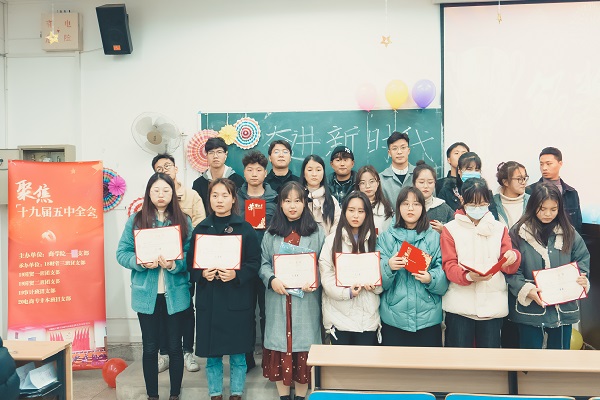 为深入学习宣传贯彻十九届五中全会精神,引导广大团员青年全面理解党和国家事业取得的非凡成就,激发奋斗精神,更好地将个人理想融入全面建设社会主义现代化国家新征程的大局之中。11月24日下午,在商学院学生第一党支部的指导下,18财管3班团支部、19国贸1班团支部、19国贸2班团支部、19审计学班团支部、20电商专升本班团支部联合开展“奋进新时代,争做好青年”主题团日活动。