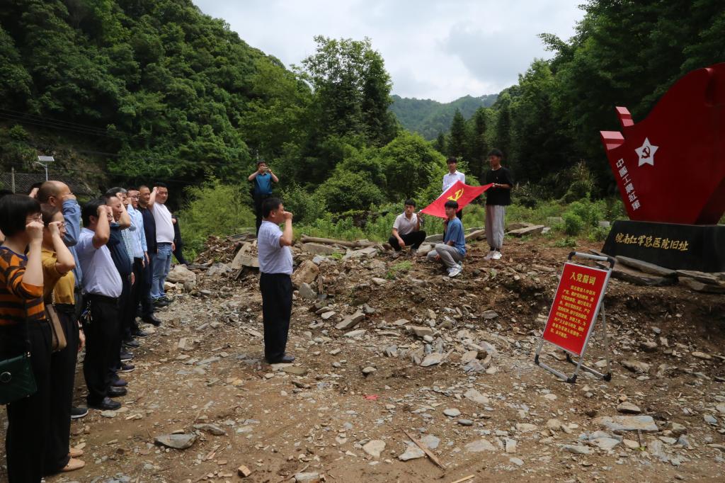 随后, 商学院教工第一党支部、池州产业投资集团有限公司产业基金(工投)公司党支部在江洪书记的带领下,在皖南红军总医院旧址,面对鲜艳的党旗,全体党员高擎右拳,庄严宣誓,重温入党誓词,追根溯源忆初心,激发动力强使命。