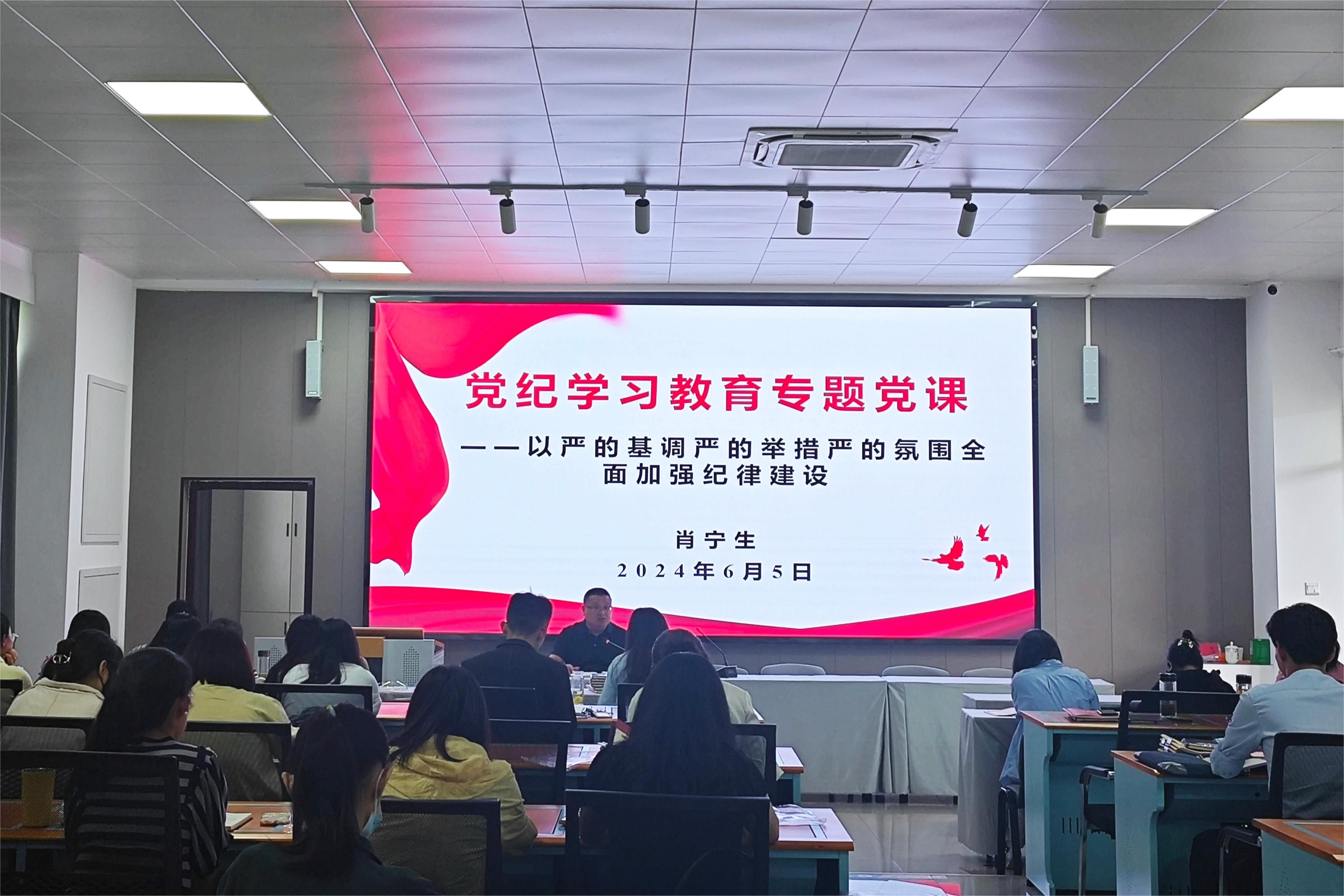 6月5日,商学院党委书记肖宁生以“以严的基调严的举措严的氛围全面加强纪律建设”为题,在博识北401会议室为全体师生党员讲授党纪学习教育专题党课。