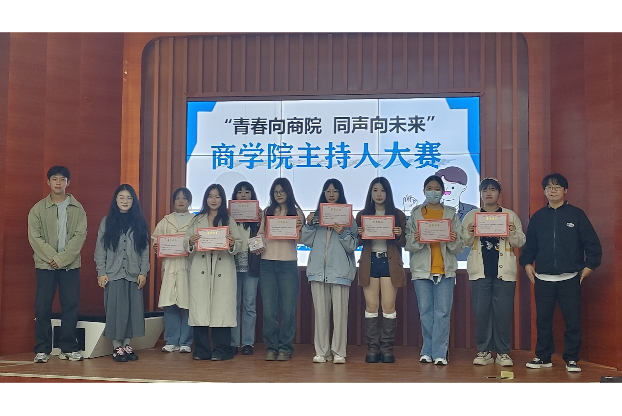 本次大赛吸引了来自商学院各年级的众多学生参与。比赛分为初赛和决赛两个阶段,经层层选拔,共有8名优秀选手参与此次决赛。决赛现场,选手们各展其才,他们或以幽默风趣的开场白吸引观众,或以声情并茂的朗诵打动人心,或以机智灵活的问答环节展现应变能力。最终叶欢同学获得一等奖,吴越同学获得二等奖,翟雨晨同学获得三等奖项鑫,张蔓,张亚茹,张怡然,熊延娜等五人获得优秀奖。