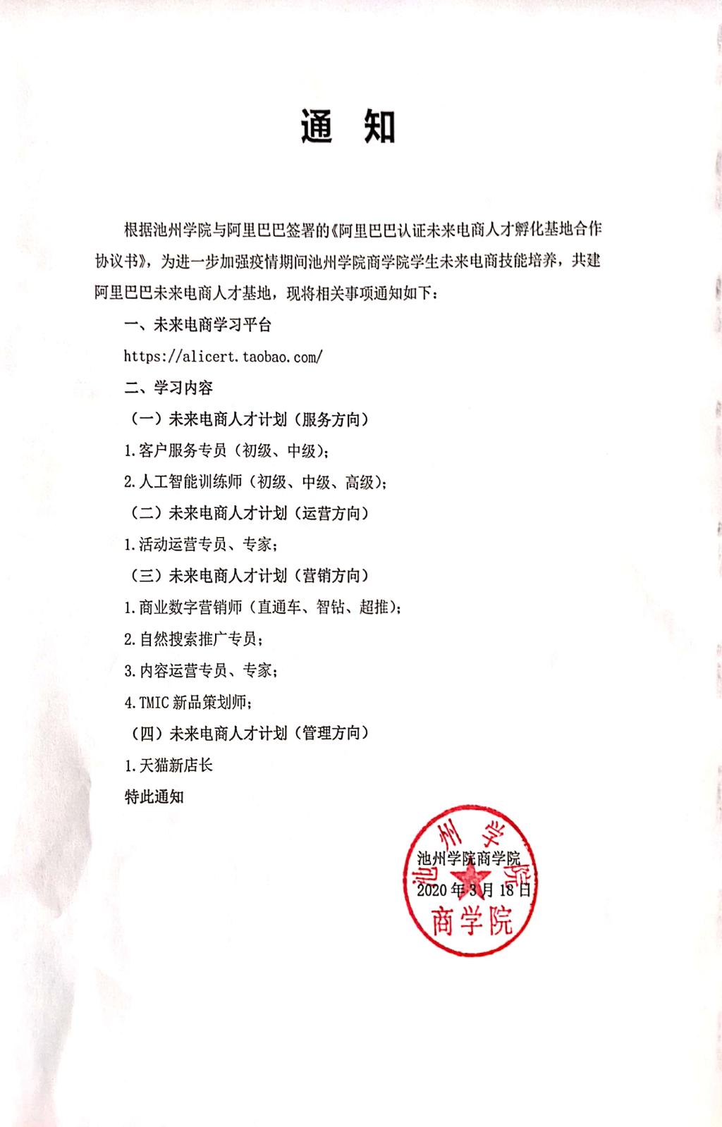 根据tyc8722太阳集团与阿里巴巴签署的《阿里巴巴认证未来电商人才孵化基地合作协议书》,为进一步加强疫情期间太阳集团网站8722学生未来电商技能培养,共建阿里巴巴未来电商人才基地,现将相关事项通知如下: