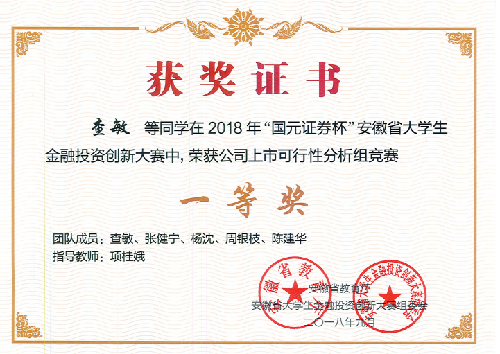 本届大赛在三个项目组展开角逐,分别为股票虚拟仿真交易组、金融投资策略设计组、公司上市可行性分析组,全省66所高校,65000余人次报名参加了本次赛事。我校共有180个团队报名参加校赛,并有40个团队成功进入省赛。决赛环节,经过专家评审,查敏团队作品《合肥立方制药股份有限公司上市可行性分析》(指导老师:项桂娥)获得公司上市可行性分析组一等奖(排名13位),伍郑超团队(指导老师:曹雪峰)、张瑶团队(指导老师:章麓)获得股票虚拟仿真模拟交易组一等奖。此外,还有7支团队获得省赛二等奖,17支团队获得省赛三等奖。