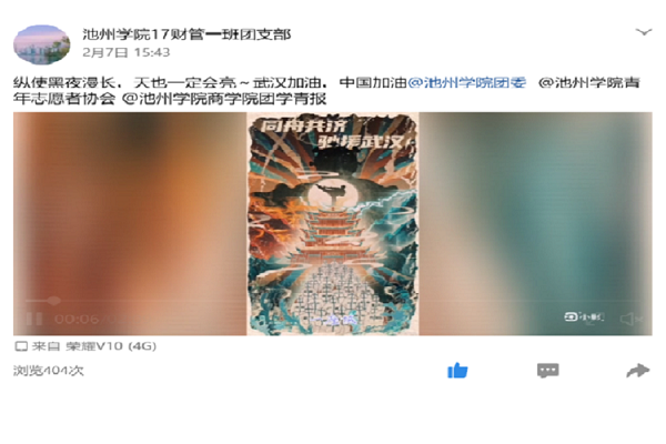本次团日活动生动反映了我院团员青年在防控疫情期间昂扬奋进、忠诚担当蓬勃向上的新时代精神风貌,努力营造了团结奋进防控疫情的浓厚氛围。商学院团委也将继续贯彻国家、学校、学院各项部署要求,将疫情防控工作落实到每一位学生,全力以赴打赢疫情防控阻击战。我们相信,只要全国人民团结一心,定会度过此次难关,武汉加油,安徽加油,中国加油!