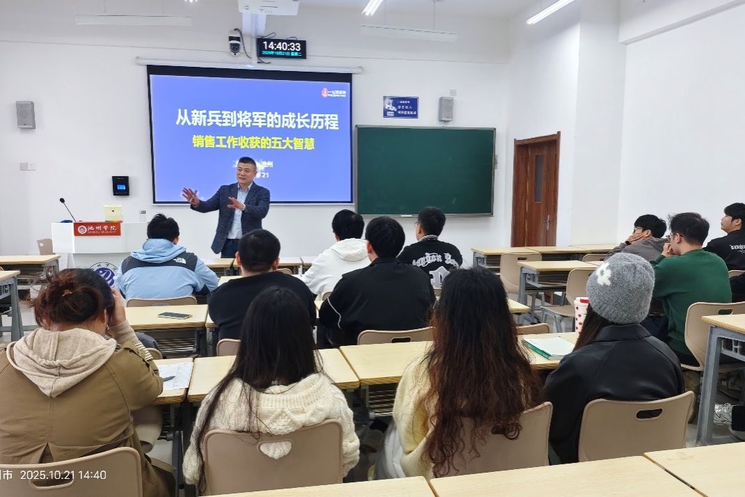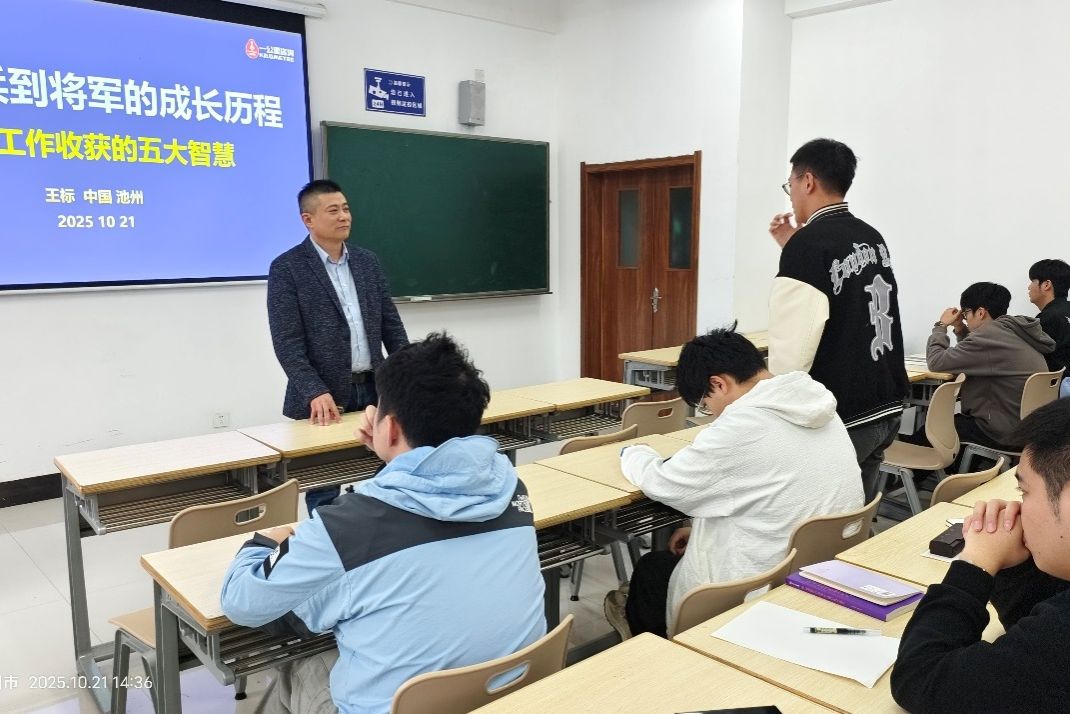 下午,王标以“从新兵到将军的成长历程——销售工作收获的五大智慧”为题,为2022级毕业生开展毕业指导宣讲。他结合自身从基层业务员到企业总裁的职场经历,系统阐述营销智慧、财富智慧、管理智慧等五大核心能力。