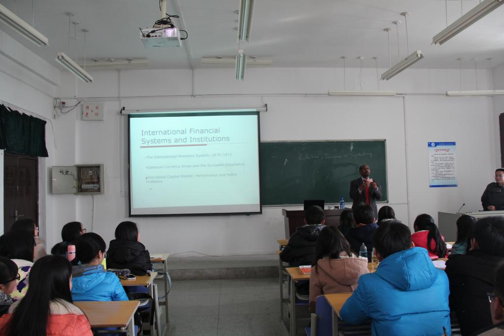 12日下午Tesfa Mehari博士在博识南302教室举行了题为“International financial institution from 1870 to now ”的讲座,讲座从生产,收入和消费简单的三个词汇开始,回顾历史上货币发行演变规律。结合相关宏观经济学知识,Tesfa Mehari博士向同学们绘声绘色介绍国际金融机构百年发展历史,并结合当前外汇热点问题,对人民币国际化进程深度讲解。我系120多名学生聆听了讲座,并与Tesfa Mehari博士进行了交流互动, Tesfa Mehari博士对学生们提出的现行美元政策利弊,SDR与世界货币发展,IMF发展及人民币国际化等问题进行一一解答,气氛热烈。通过此讲座使我院学生了解了最新国际经济学研究动态,同时感受英式教育方式与氛围,更好的激发学生学习热情。
