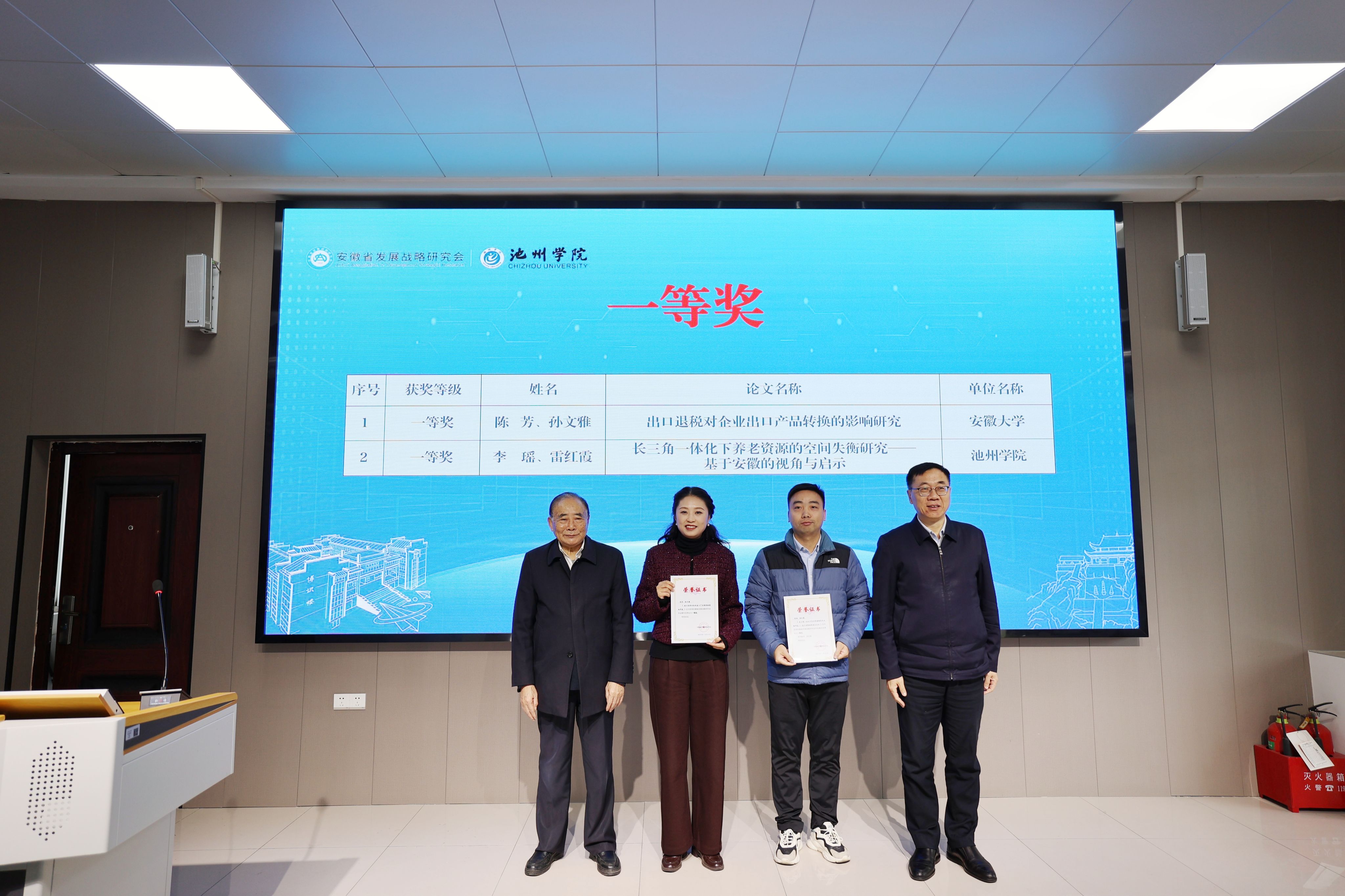 开幕式上,与会领导嘉宾集体合影,并为安徽省发展战略研究会年会青年优秀论文获奖者颁奖。我校四篇论文获奖,其中,《长三角一体化下养老资源的空间失衡研究——基于安徽的视角与启示》获得一等奖(作者:李瑶、雷红霞),《多模态AI数字人的用户体验与员工满意度提升策略》获得二等奖(作者:华潮、王思甜、吴自爱),《乡村旅游资源高质量开发利用的驱动逻辑、困境与路径选择——基于新旅游资源观视角的思考》获得三等奖(作者:刘飞、华潮),罗娟老师获得学术新星奖。